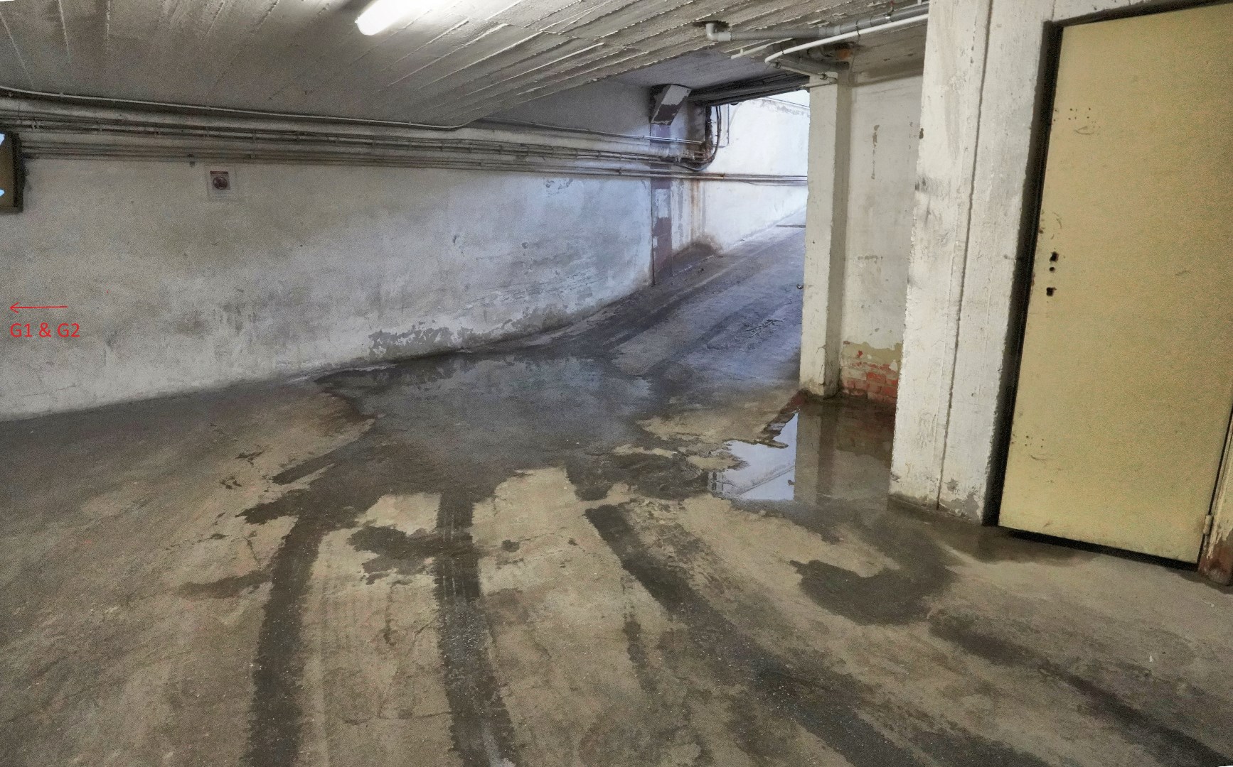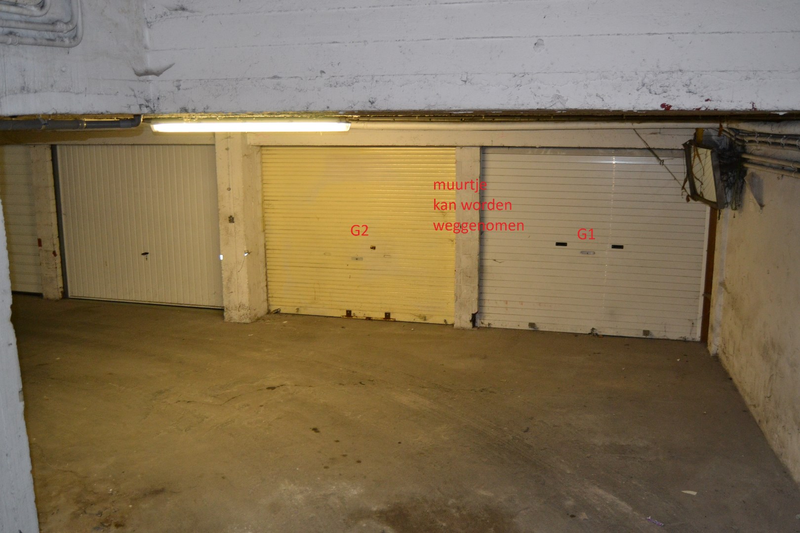 G18 & G19 hebben geen tussenmuur (die kan worden her- en verplaatst) maar momenteel nog wel 2 oude rolpoorten. Deze laatste kunnen zonder problemen worden vervangen door 1 brede rol- of sectionaalpoort. Dan kunnen hier ook, mits wat manoeuvres (lift gebouw deels in de weg) 2 auto’s naast elkaar staan .