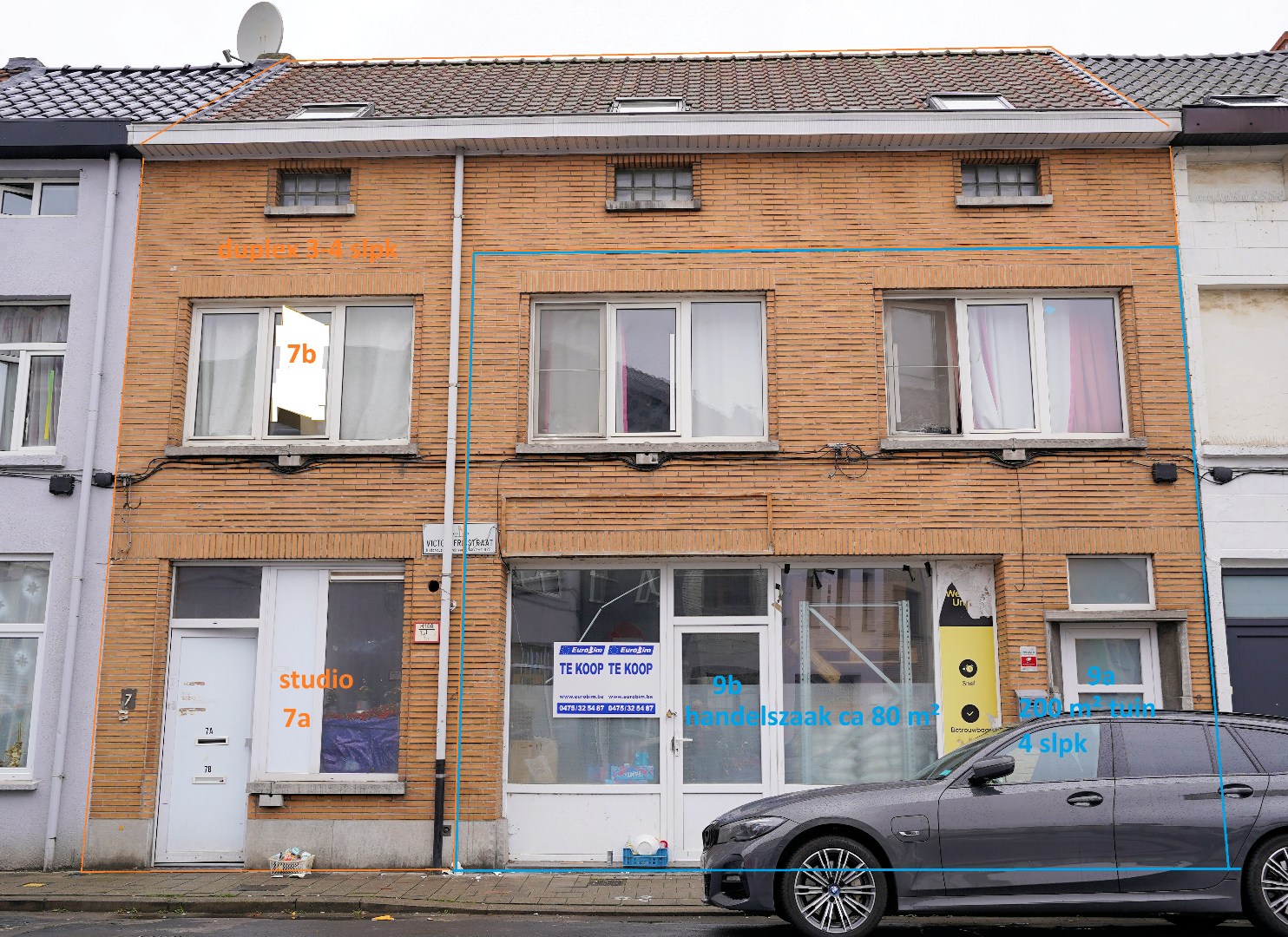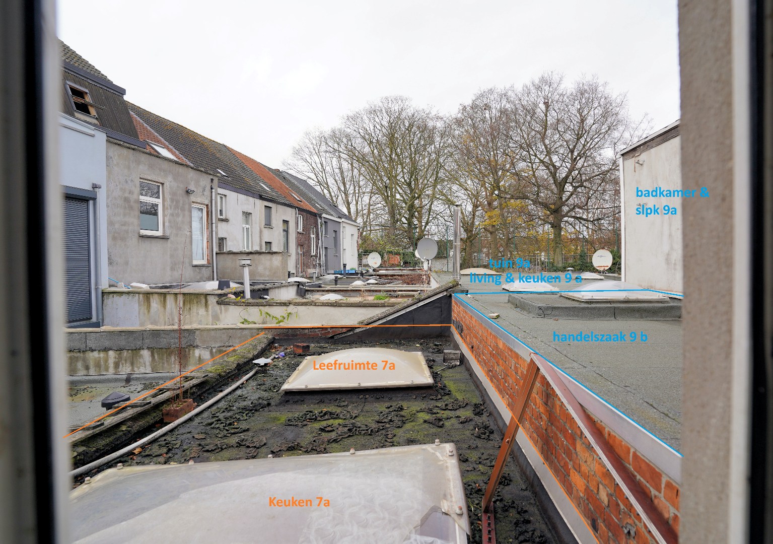 600,- studio / 800,- het duplexappt / 1.000,- het kabinet (momenteel opslagruimte, voorheen garage) / 1.100,- woning, of 3.500,- totaal. Mits (grondige) renovatie van 7a & 7b kan zeker meer worden bekomen. 9 vraagt op de verdieping tenminste een zadeldakcontrole (kan puur liggen aan een verstopte goot); de platte daken zijn in uitstekende staat, zoals het schrijnwerk keuken en deel vh sanitair.
