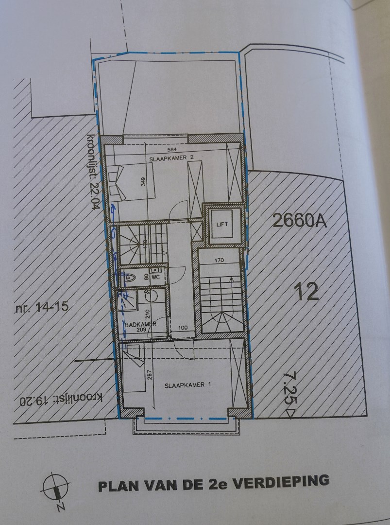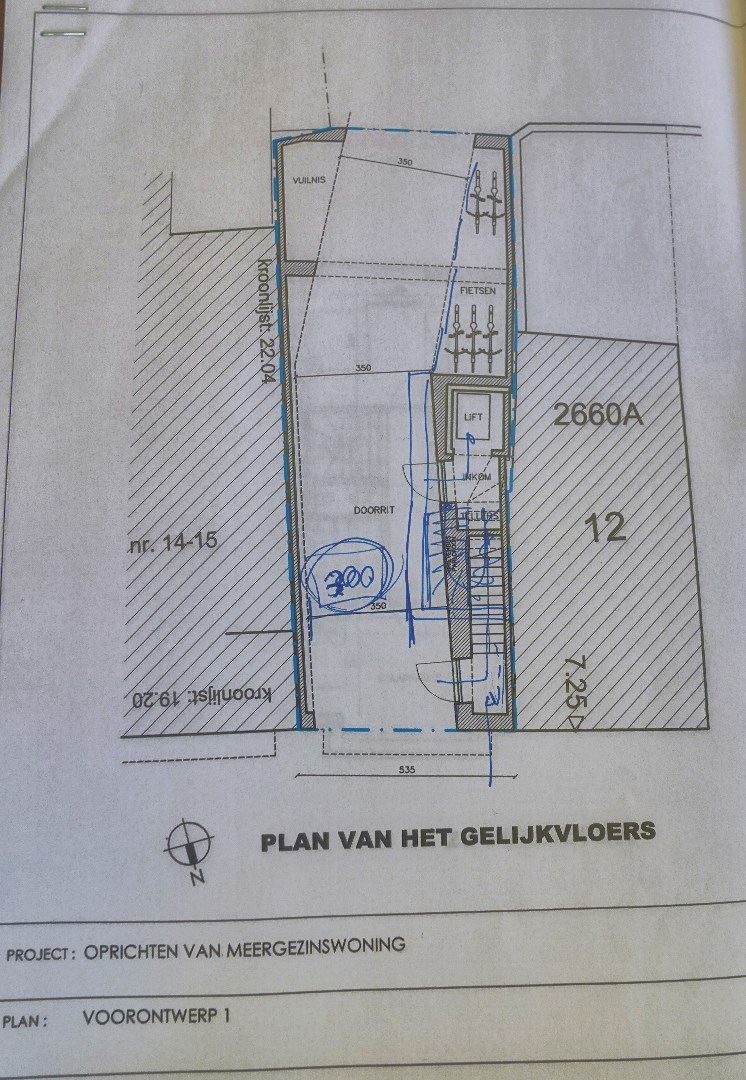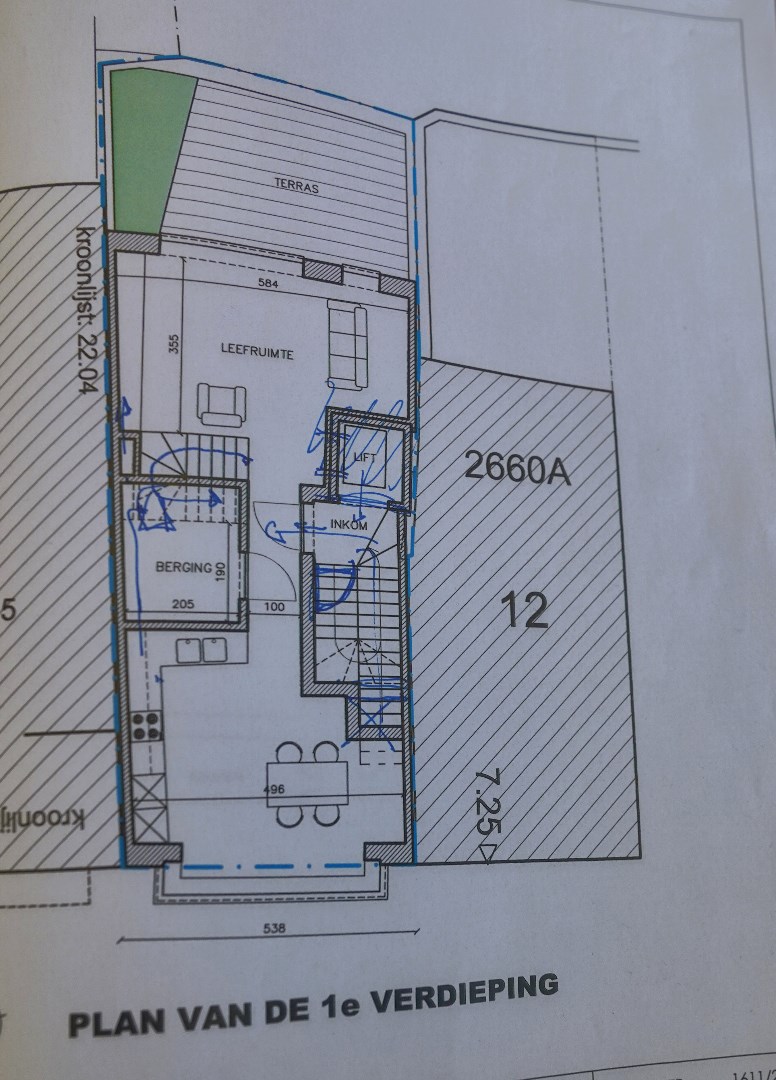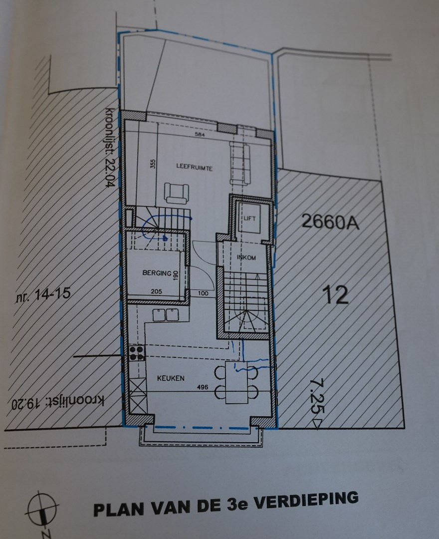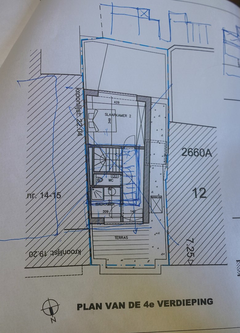 Door de vorige eigenaar werd een plan ingediend van 2 duplexen boven elkaar en dit werd gunstig onthaald; 4 studio’s zou mogelijks een alternatief zijn. Terrassen zijn pal in het zuiden gericht.