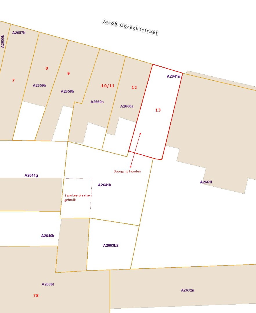 Bij deze grond hoort het eeuwigdurend gebruik van 2 autostaanplaatsen op het belendend perceel achteraan.