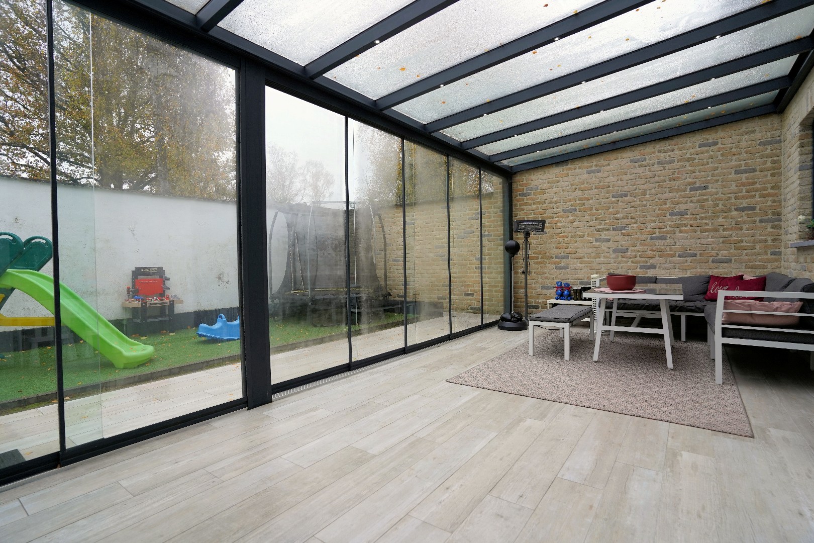 Een recent geplaatste veranda met openschuivend front maakt het buitenleven aangenamer. De tuin is onderhoudsvrij.